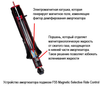 Принцип работы подвески Magnetic Selective Ride Control построен на использовании физических свойств магнитореологических жидкостей, то есть таких, что могут изменять свою жесткость в электромагнитном поле. На практике идея была реализована следующим образом. Гидравлические однотрубные амортизаторы производства Delphi, входившие в состав F55, не имели привычных перепускных клапанов – внутренний объем амортизаторов заполнялся жидкостью, которая представляла собой суспензию мельчайших металлических частиц в синтетическом углеводороде (силиконе). Консистенция этой жидкости, а, следовательно, и жесткость амортизаторов варьировалась в режиме реального времени посредством приложения электромагнитного поля, значение которого корректировалось в соответствии с характеристиками дорожного полотна.